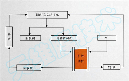 濕法煉銅生產(chǎn)中產(chǎn)生大量的電解貧液,若用石灰中和,除造成酸和銅的損失外,還引發(fā)環(huán)境問題。用陰膜擴(kuò)散滲析回收電解貧液中的廢酸再返回系統(tǒng)使用,這樣既為企業(yè)節(jié)約了資源,又解決了環(huán)境污染問題。